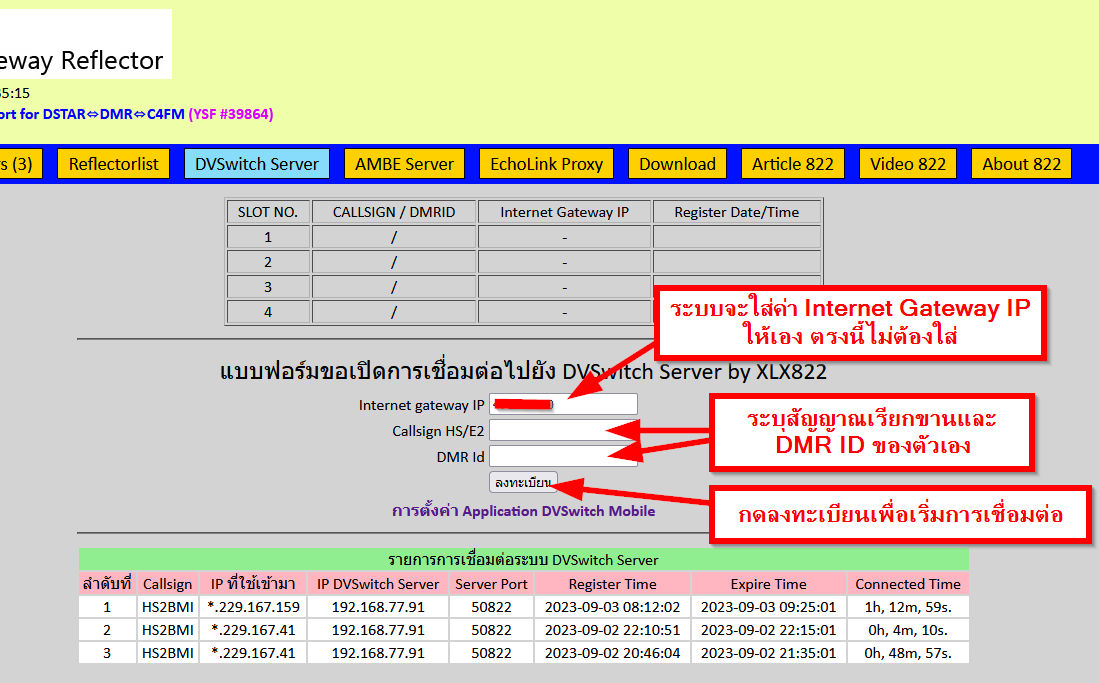 การกรอกแบบฟอร์มเพื่อขอเปิดการเชื่อมต่อ ผู้ใช้เพียงแค่ใส่สัญญาณเรียกขานและ DMR ID ของตัวเองให้ถูกต้องเท่านั้น